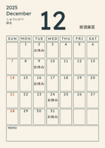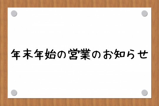2025年12月と2026年1月の営業日のお知らせ お知らせ 2025.11.20 2025年12月と2026年1月の休業日のご案内 平素より格別のご愛顧を賜り、心より御礼申し上げます。 12月23日(火) 12月30日(火) 通常営業 12月24日(水) 12月31日(水) 1月1日(木) 休業 1月2日(金) 営業開始 皆様のご来店を心よりお待ち申し上げております。